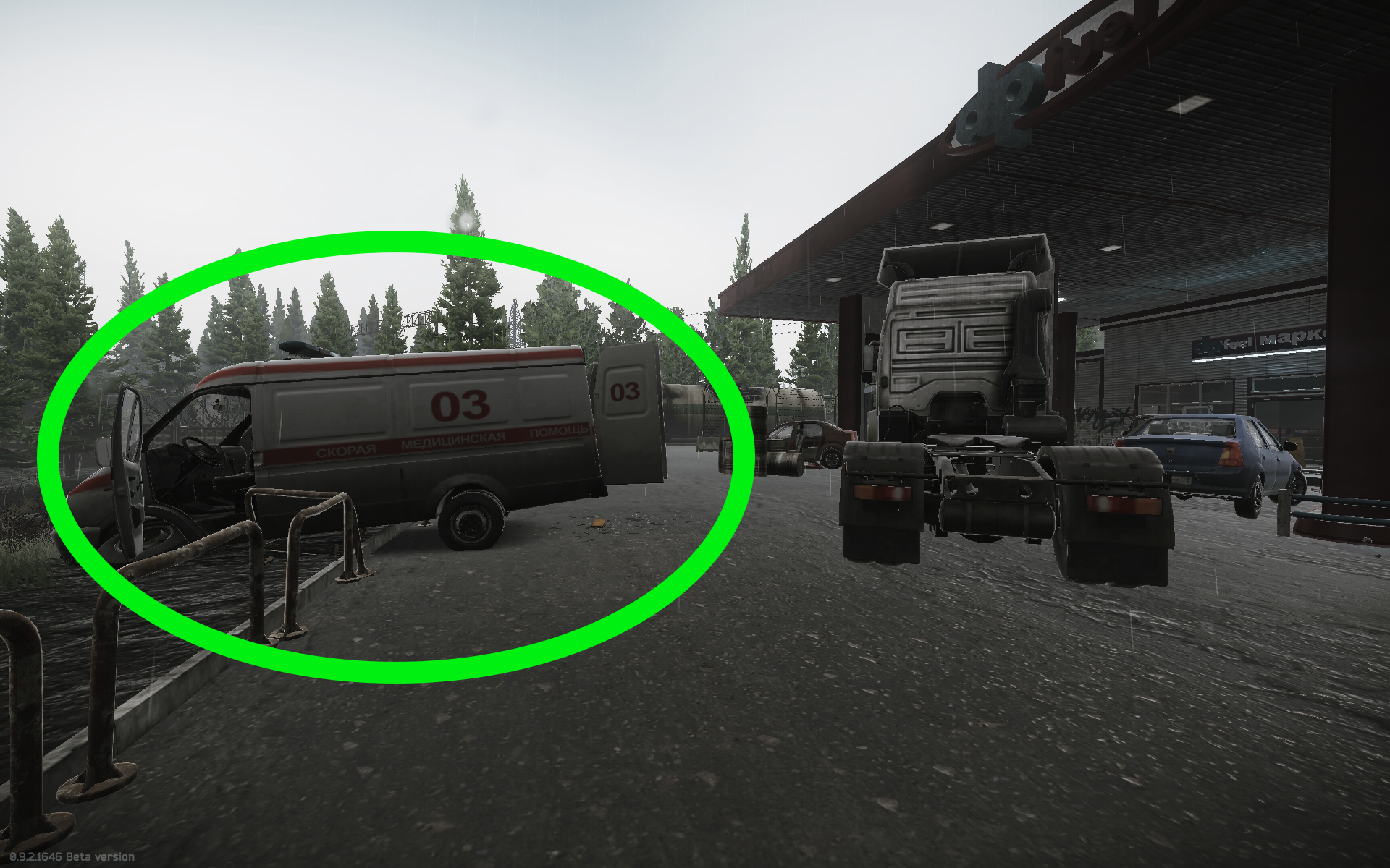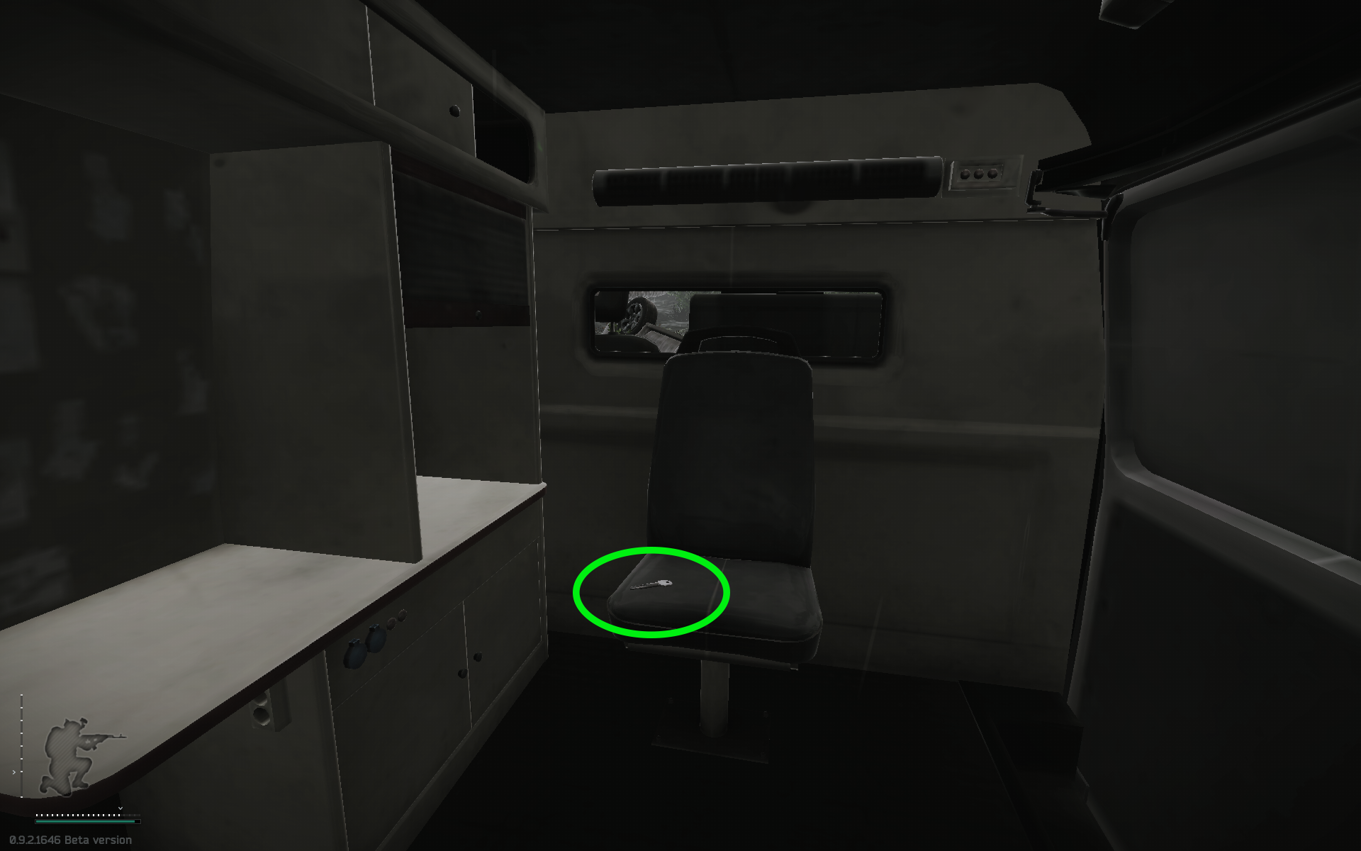 - Sanitka u velké čerpací stanice. Musíš skočit dovnitř a vzít klíč ze sedadla..