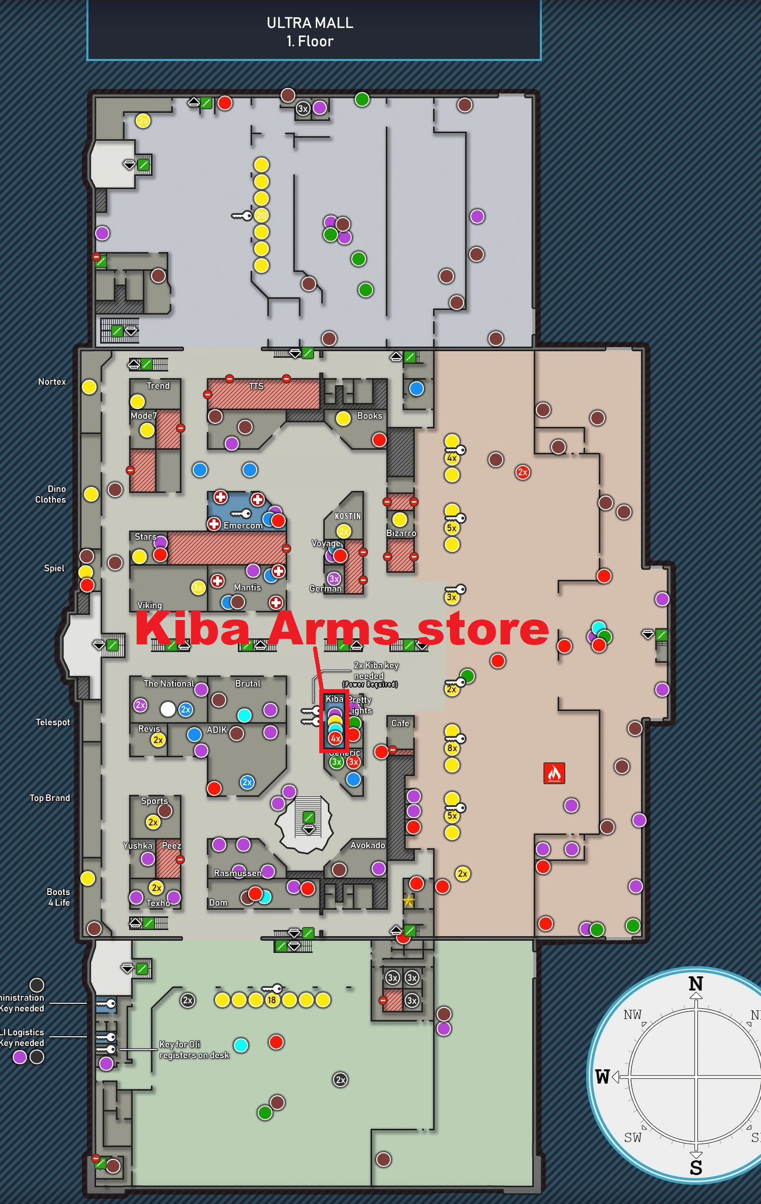 | Klíč k venkovním dveřím Kiba Arms | 1 | Vyžadováno | N/A | Odemkne vnější dveře skladu Kiba Arms | |