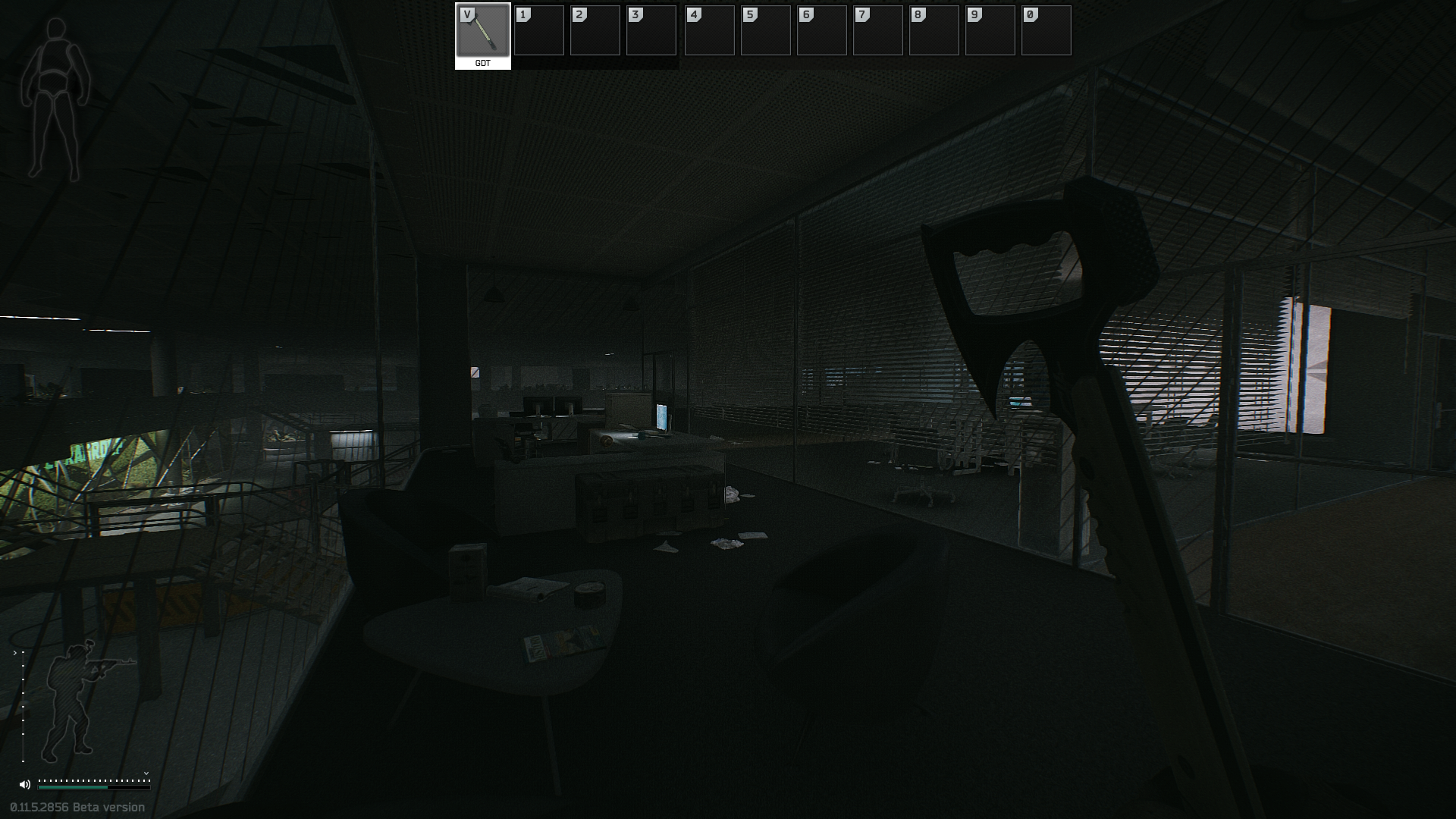 1. patro uvnitř tmavé místnosti, pod místností na červenou kartu |