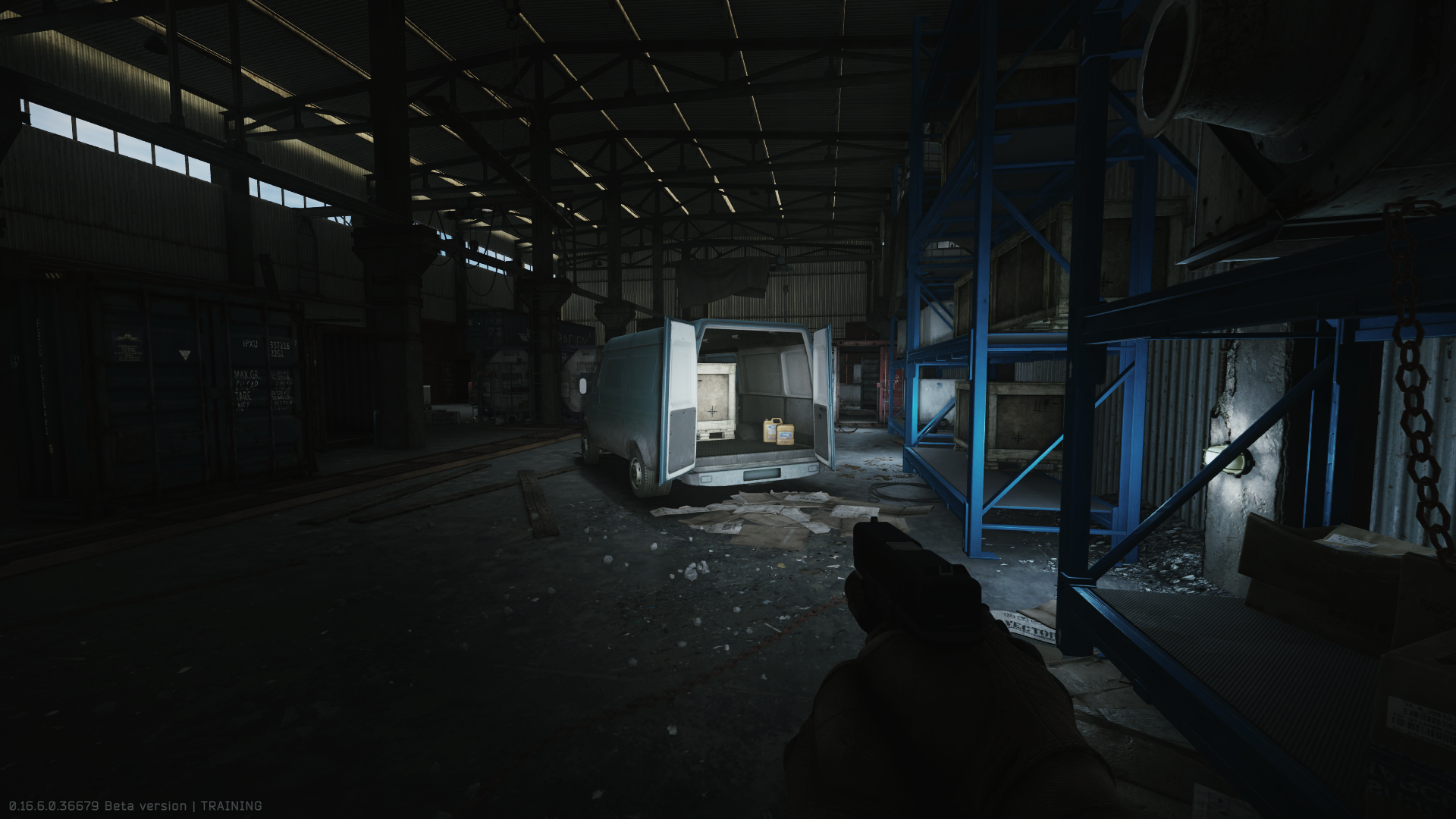 Sklad s vozidlem uvnitř.