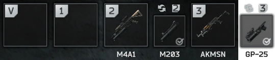 - Pour utiliser le GP-25, appuyez sur la touche de raccourcis (ex : 2 ou 3) pour l'arme sur laquelle il est monté, en ayant l'arme dans les mains.