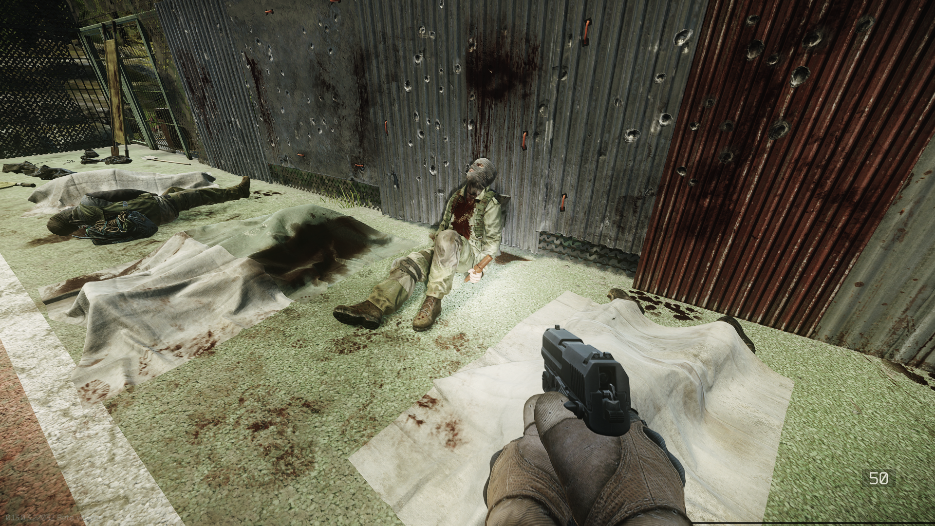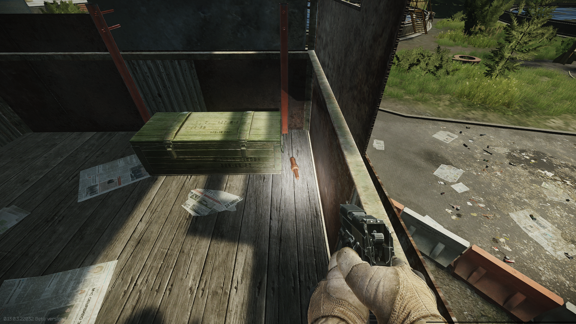 On the roof of building #3, ontop of a wooden crate near the tented area with the NSV heavy machine gun.