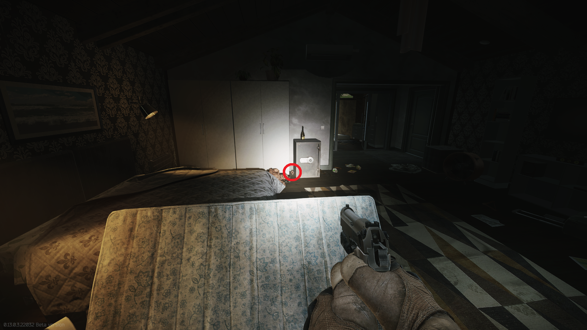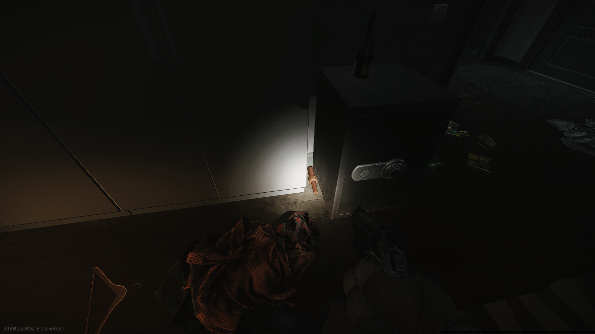On the second floor in the northwestern bedroom on the ground between the closet and the safe.