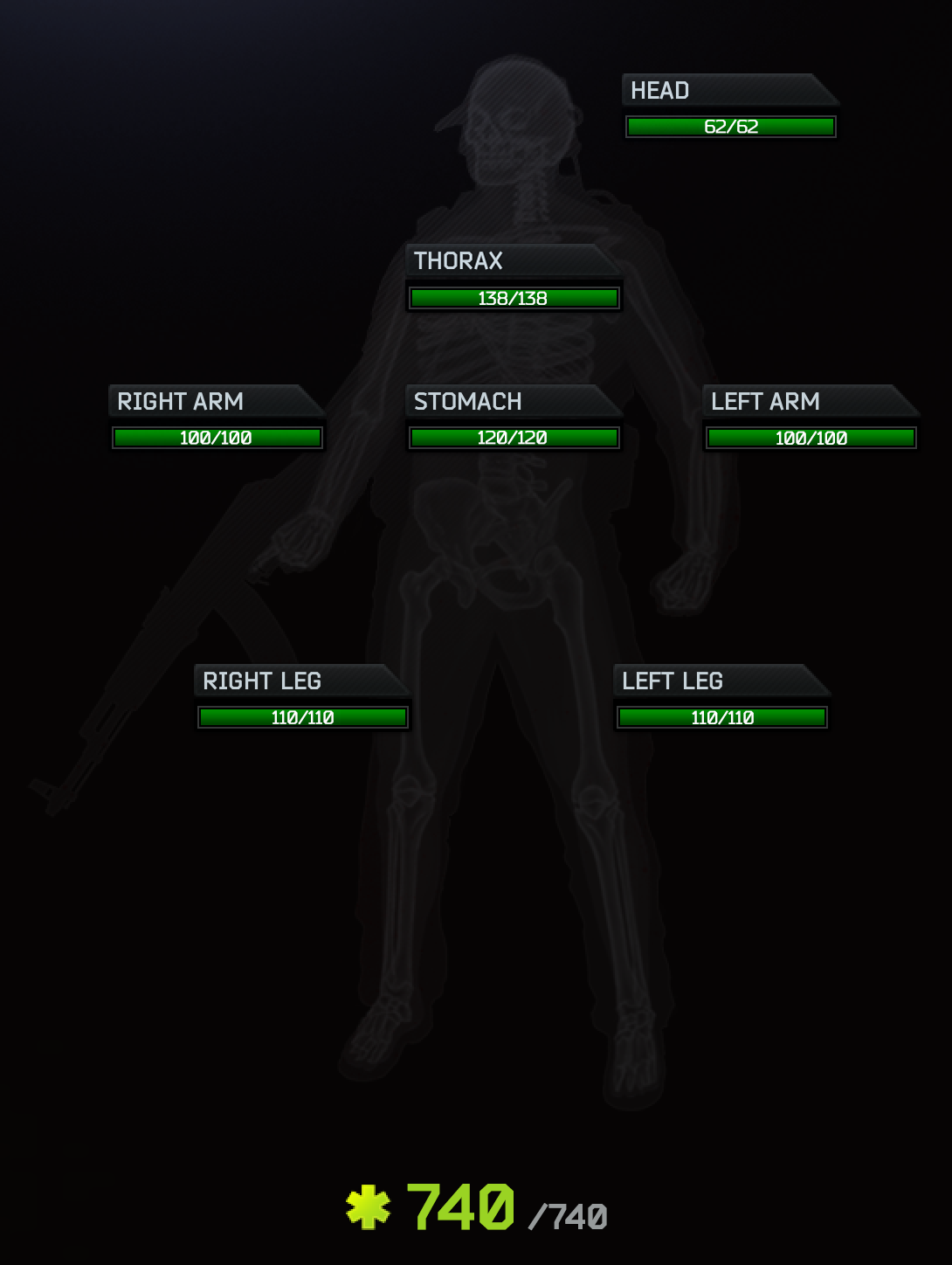 Thorax: 138 Stomach: 120 Arms: 100 each Legs: 110 each Total: 740 |